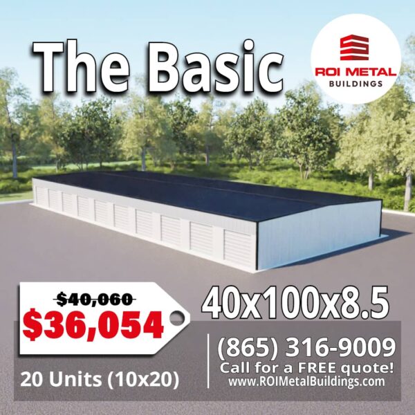 Designed for 115 mph wind speed, Exposure C, and 30 lb roof snow load, this structure is built for demanding climates and open terrain. The 0.5:12 gable roof pitch is optimized for drainage and long‑term performance. Standardized engineering and common materials reduce cost and speed up delivery. With 20 rentable units, this model is ideal for new operators or expansions looking for predictable, high‑yield returns. This model includes 20 individual 10×20 units, each with its own premium mini‑storage door. Yes. Premium roll‑up mini‑storage doors are included, available in 12 color options. This special is pre‑engineered with fixed unit sizes. Custom mixes are available through a separate design request. Yes. 29-gauge Galvalume partitions are included for clean, durable separation between units. A 20‑unit building can often be erected in several days to a couple of weeks, depending on crew size, weather, and site prep. Yes. Insulation and HVAC are optional upgrades. Climate‑controlled units require additional interior framing and mechanical planning. Engineered for Harsh Conditions